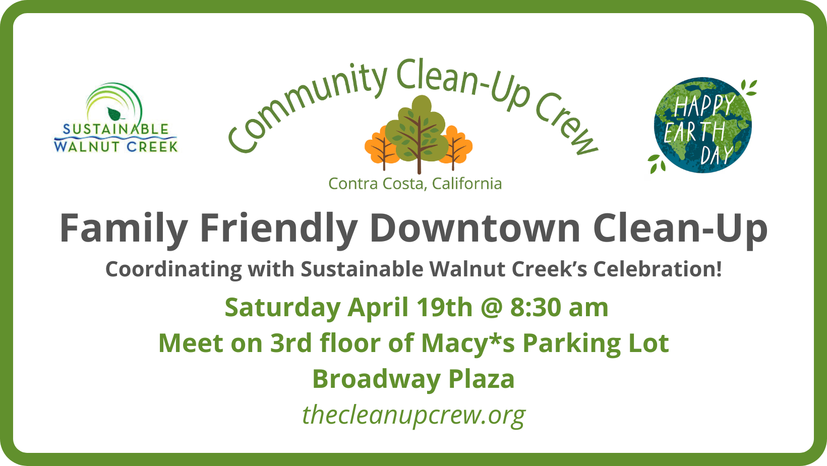 Please save the date for our next Downtown Clean-Up in coordination with Sustainable Walnut Creek's Earth Day Celebration at Civic Park. Our event will kick off from the Macy*s Broadway Plaza parking lot (3rd floor). Note that first 3 hours or parking are free. We'll be cleaning Walnut Creek, all the way from Whole Foods to BART. We’ll break up into 7 teams with specific routes so we get it all done in about 90 minutes. And — hot off the press - The Mayor or Walnut Creek Cindy Darling is coming with donuts to kick it off! Here's what you need to know: • Events last 90 minutes. • All are welcome. • Please wear long pants. • Bring a pair of gardening gloves. • We will provide you with a safety vest & trash bags. • Please bring a litter picker if you have one, otherwise we have loaners available.