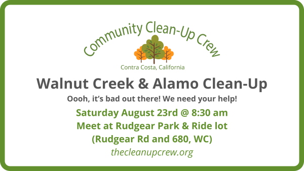 Come join the Community Clean-up Crew this Saturday at 8:30am!  Help clean up trash on the off ramps and streets of our community. Meet at the park and ride lot on Rudgear Road and 680 in Walnut Creek.
